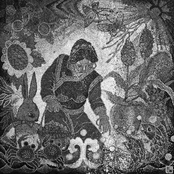 《木兰从军》是李秋新创作的一幅大型五谷粮食画,以天然谷物演绎巾帼传奇,将南北朝叙事诗《木兰辞》的雄浑气魄融入其中,开创了传统题材与现代工艺对话的新范式。画面上的木兰衣袂飘飘,正在演绎激昂的古筝弹拨乐,与背景刀光剑影的战场遥相呼应。作品全部由五谷粘贴而成,将谷物的天然属性转化为艺术语言:以黑色菜籽勾勒轮廓线条,形成自然过渡的渐变效果;用糜子颗粒排列的疏密制造光影变化,表现阳光洒落的感觉;采用“浮雕式”粘贴技法,将不同厚度的谷物层层叠加,展现人物衣服上的褶皱。这种“零染色”工艺不仅保留了谷物原始的生命力,更通过精准的粘贴,使画面远看呈现油画般的厚重质感,近观则充满了呼吸感。驻足于这幅由数万粒谷物组成的画作前,既能感受到“朔气传金柝”的战场肃杀,又能触摸到“对镜贴花黄”的温婉柔情。