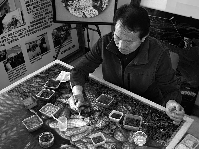 李秋新正在创作五谷粮食画