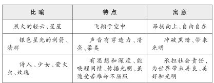 1.从诗歌标题我们知道,“致云雀”就是写给云雀的一首诗或者说是“一封信”,作者围绕“云雀”呈现了密集的意象群,请同学们找出这些意象,并分析这些意象的作用。(如下表)