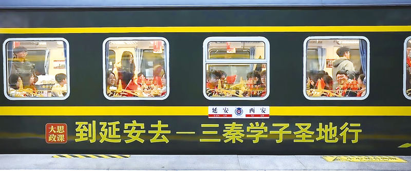 9月13日上午,西安火车站站台上红旗飘扬,首趟“到延安去·三秦学子圣地行”红色专列满载600名高校学子缓缓开动,驶向革命圣地延安。车窗上,宝塔山图案与大思政课标语交相辉映;车厢内,学生们眼中充满期待。一场以车厢为课堂、以圣地为教材的沉浸式红色之
