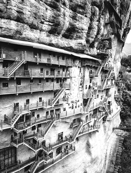 跟许多名山大川比起来,麦积山的石窟群更像是藏在深山里的珍宝。崖壁陡峭如刀削斧凿,人站在下面抬头望,不消片刻脖子就酸痛不已。栈道就顺着崖壁弯弯曲曲地修,木板被一串又一串脚步磨得发亮,走在上面,脚下咯吱作响。唯有历经磨难,方能探得那一方岁月沉淀后的安宁。